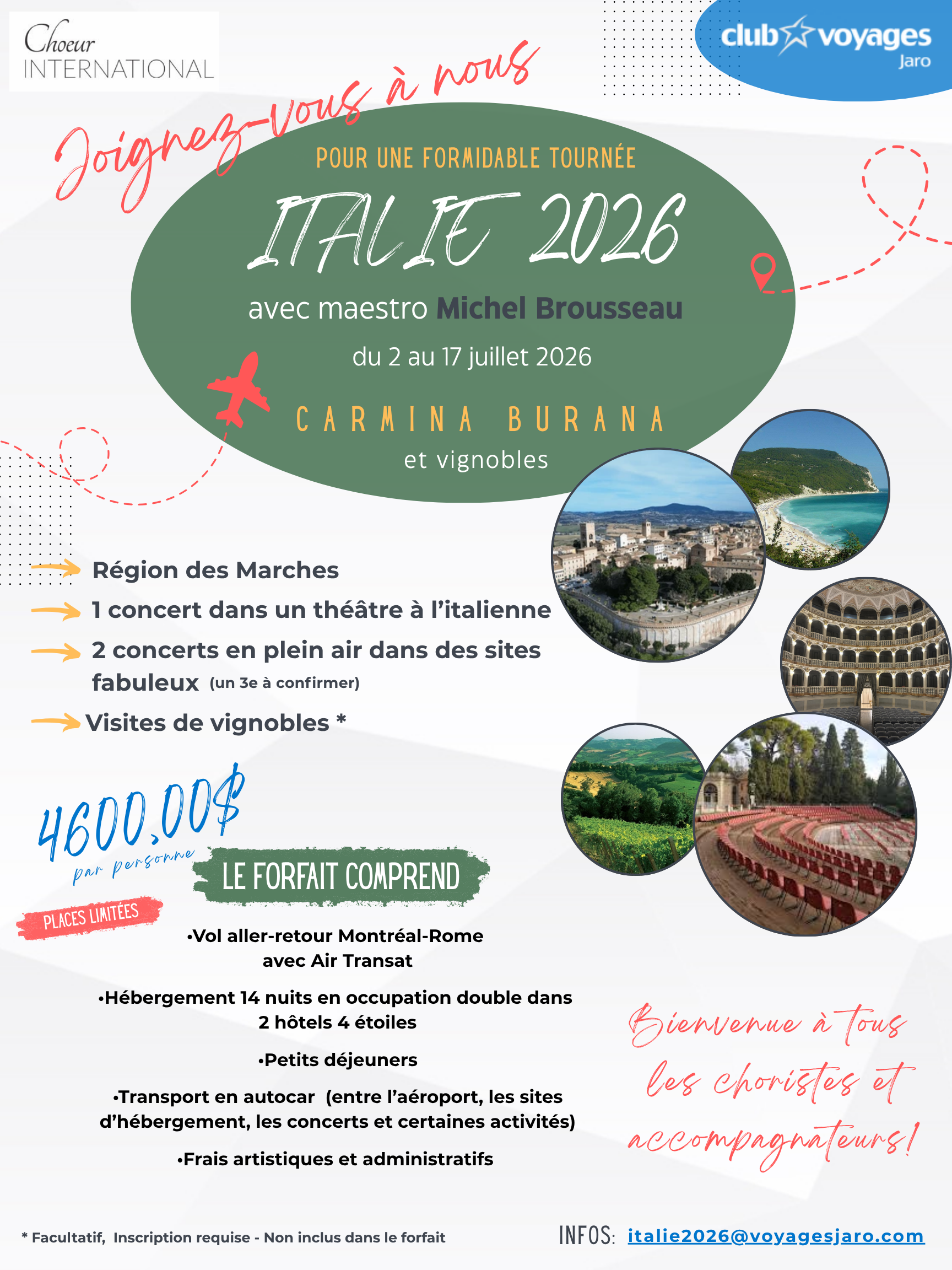Mission : Le Chœur international, fondé et dirigé par Michel Brousseau, Chef et directeur artistique, a double mission d’organiser des tournées et des projets à vocation artistique à l’échelle internationale, et d’offrir, par la même occasion, à des chanteurs amateurs la possibilité de donner des concerts avec des artistes professionnels.
